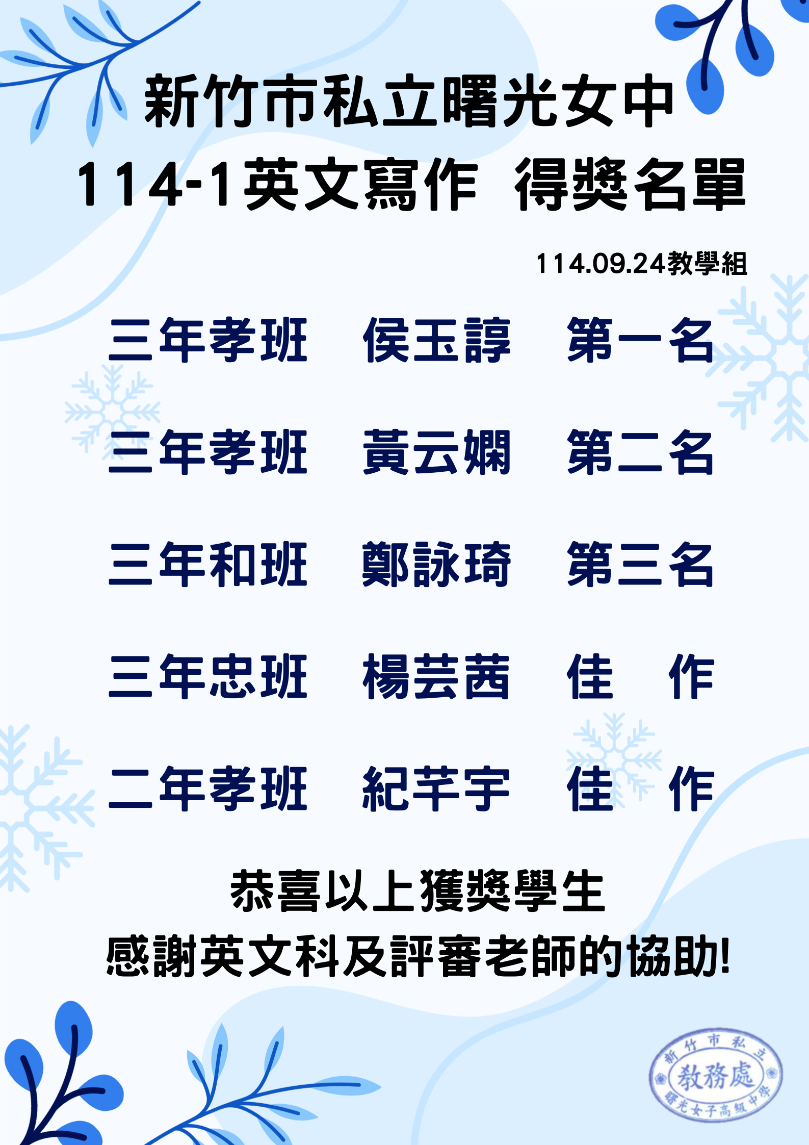 校園公告 公告主旨 【教學組】高中部114-1英文寫作比賽_得獎名單 發佈日期 2025 年 9 月 30 日 發佈單位 教務處 公告類別 最新消息, 榮譽榜, 學生專區 公告等級 無 點閱次數 106 公告內容 得獎名單如附件 相關附件 114-1英文寫作名單 114-1英文寫作名單 檔案名稱檔案大小檔案格式下載114-1英文寫作名單.png440.14 KB新視窗開啟檔案 114-1英文寫作名單.png 【2025-09-30】【教學組】高中部114-1全國英文單字比賽_得獎名單 【2025-09-30】【教學組】高中部114-1英文演講比賽_得獎名單