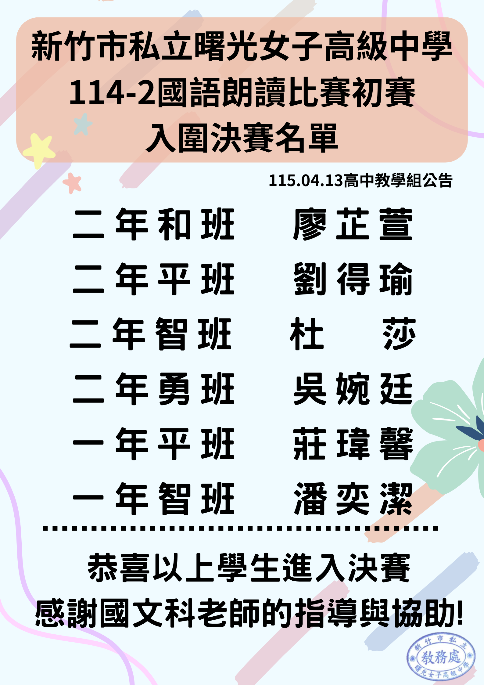 校園公告 公告主旨 【教學組】高中部114-2高一二國語朗讀比賽初賽入圍決賽名單 發佈日期 2026 年 4 月 13 日 發佈單位 教務處 公告類別 最新消息, 學生專區 公告等級 無 點閱次數 33 公告內容 相關附件 【2026-04-13】【教學組】高中部114-2高一二國語演說比賽初賽入圍決賽名單