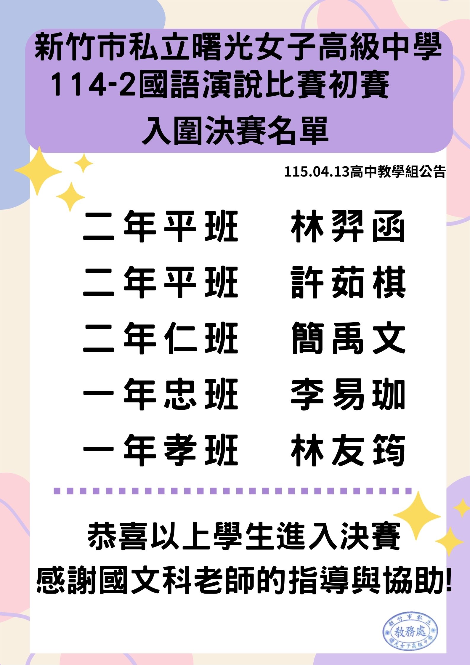 校園公告 公告主旨 【教學組】高中部114-2高一二國語演說比賽初賽入圍決賽名單 發佈日期 2026 年 4 月 13 日 發佈單位 教務處 公告類別 最新消息, 學生專區 公告等級 無 點閱次數 35 公告內容 相關附件 【2026-04-13】【教學組】高中部114-2高一二國語朗讀比賽初賽入圍決賽名單 【2026-04-13】【校車公告】曙光女中4/20~4/25交通車車趟表