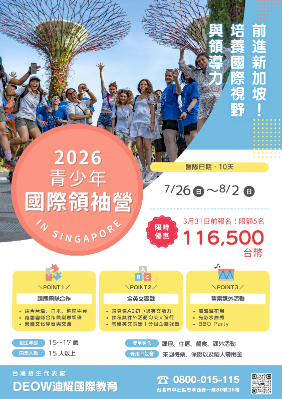校園公告 公告主旨 【轉知】 2026 新加坡青少年國際領袖營 發佈日期 2026 年 4 月 23 日 發佈單位 教務處 公告類別 最新消息, 學生專區, 師生研習及營隊資訊 公告等級 無 點閱次數 13 公告內容 詳情如附件 相關附件 2026新加坡青少年國際領袖營海報 2026新加坡青少年國際領袖營海報 檔案名稱檔案大小檔案格式下載2026新加坡青少年國際領袖營海報.png531.89 KB新視窗開啟檔案 2026新加坡青少年國際領袖營海報.png 【2026-04-23】教育部國民及學前教育署開設「高級中等學校線上AI課程」案 【2026-04-23】【轉知】國立陽明交通大學第十八屆APX全國高中數理能力檢定報名資訊