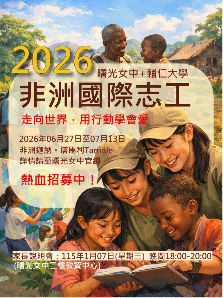 | 公告內容 | 曙光女中2026【非洲迦納國際志工】 懷著仁愛的心,走向世界的盡頭。 這不只是一趟旅程, 👨🎨報名:家長說明會 https://forms.gle/p879N1bovfCXEtgK9