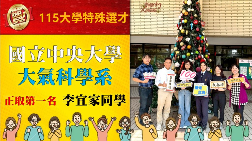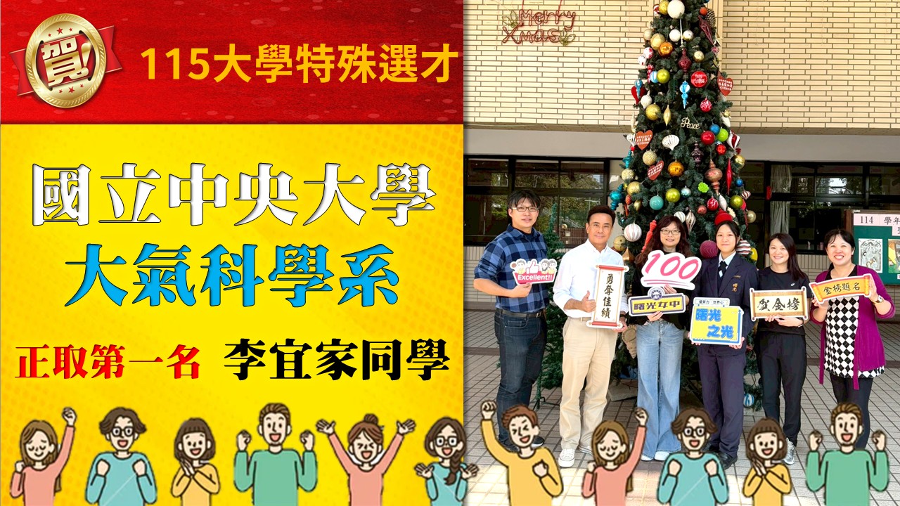 校園公告 公告主旨 三孝李宜家同學正取國立中央大學-大氣科學系 發佈日期 2025 年 11 月 24 日 發佈單位 教務處 公告類別 最新消息, 榮譽榜, 學生專區 公告等級 狂賀 點閱次數 67 公告內容 狂賀~ 三孝李宜家,透過特殊選才入學管道,正取: [國立中央大學 – 大氣科學系,正取(第一名)] 特別感謝導師、任課老師們的長期指導! 相關附件 特殊選才李宜家 特殊選才李宜家 檔案名稱檔案大小檔案格式下載特殊選才李宜家.jpg331.73 KB新視窗開啟檔案 特殊選才李宜家.jpg 【2025-11-24】函轉財團法人商業發展研究院辦理「2026年台灣第二屆模擬聯合國會 ... 【2025-11-24】新竹市社會福利服務中心辦理「青朋好遊」-114年新竹 市政府跨局 ...
