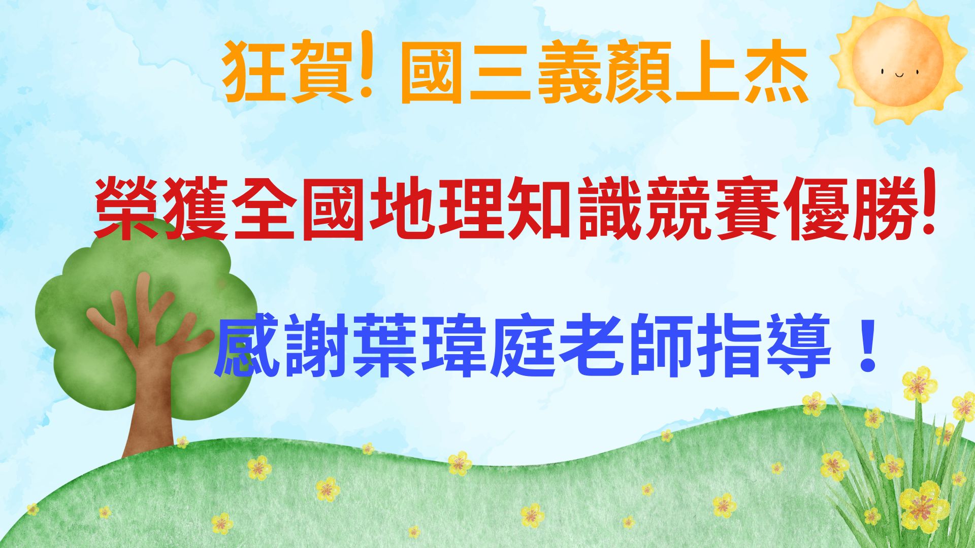 校園公告 公告主旨 全國地理知識競賽榮獲佳績! 發佈日期 2025 年 11 月 07 日 發佈單位 國中部課研組 公告類別 最新消息, 榮譽榜 公告等級 狂賀 點閱次數 33 公告內容 相關附件 【2025-11-07】【教學組】高中部第19屆聯合盃作文大賽_新竹市初賽得獎名單 【2025-11-07】「生命聊天室」線上研習課程