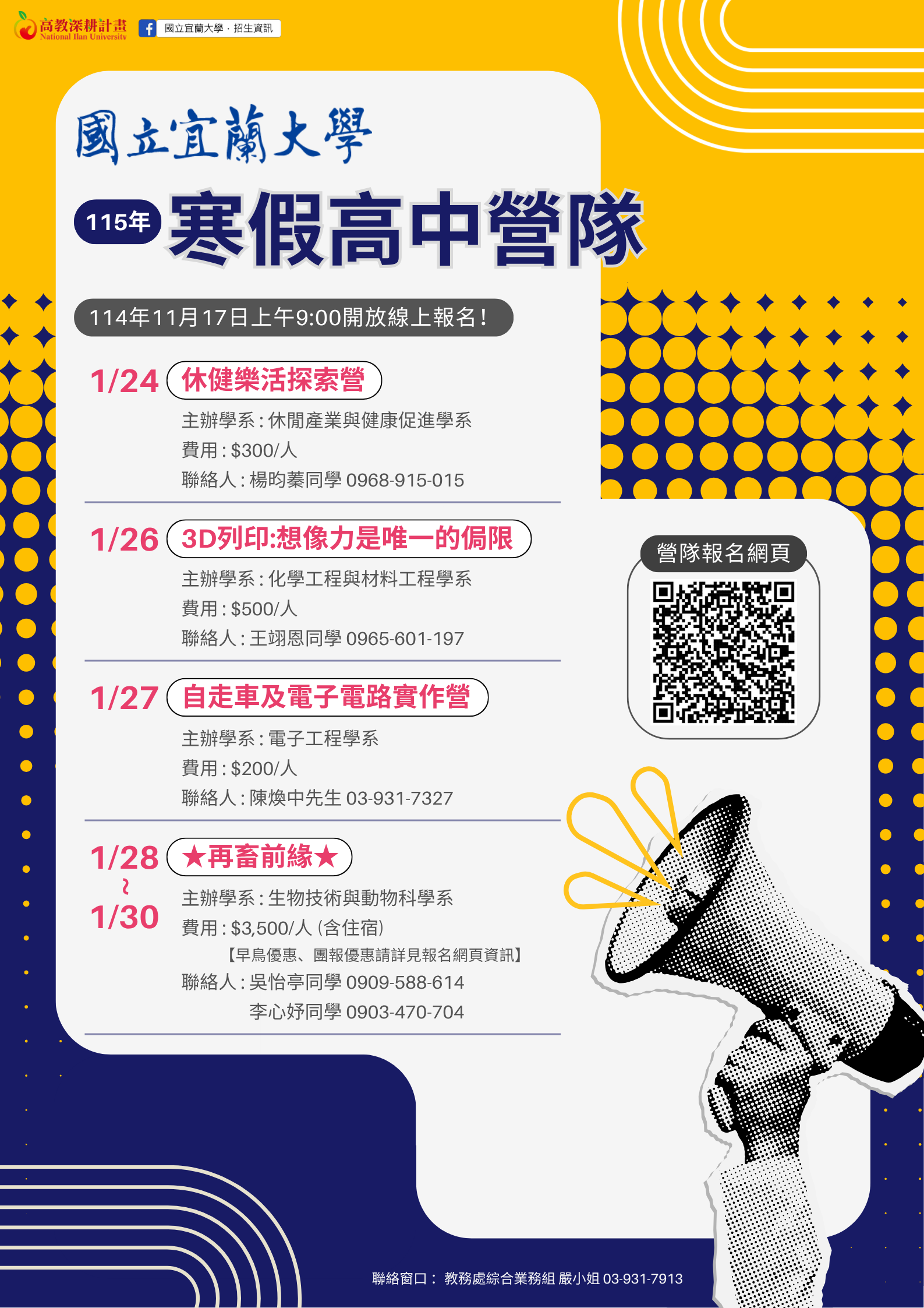 | 公告內容 | 一、檢附活動海報乙份,完整訊息請至活動網站(網址:https://sites.google.com/ems.niu.edu.tw/115winter),或由國立宜蘭大學首頁(網址:https://www.niu.edu.tw)/招生資訊/在宜大夢想起飛/高中營隊查詢。 二、如有任何活動問題,請與教務處綜合業務組嚴珮萱小姐聯繫,電話:(03)935-7400分機7913,信箱:phyen@niu.edu.tw |