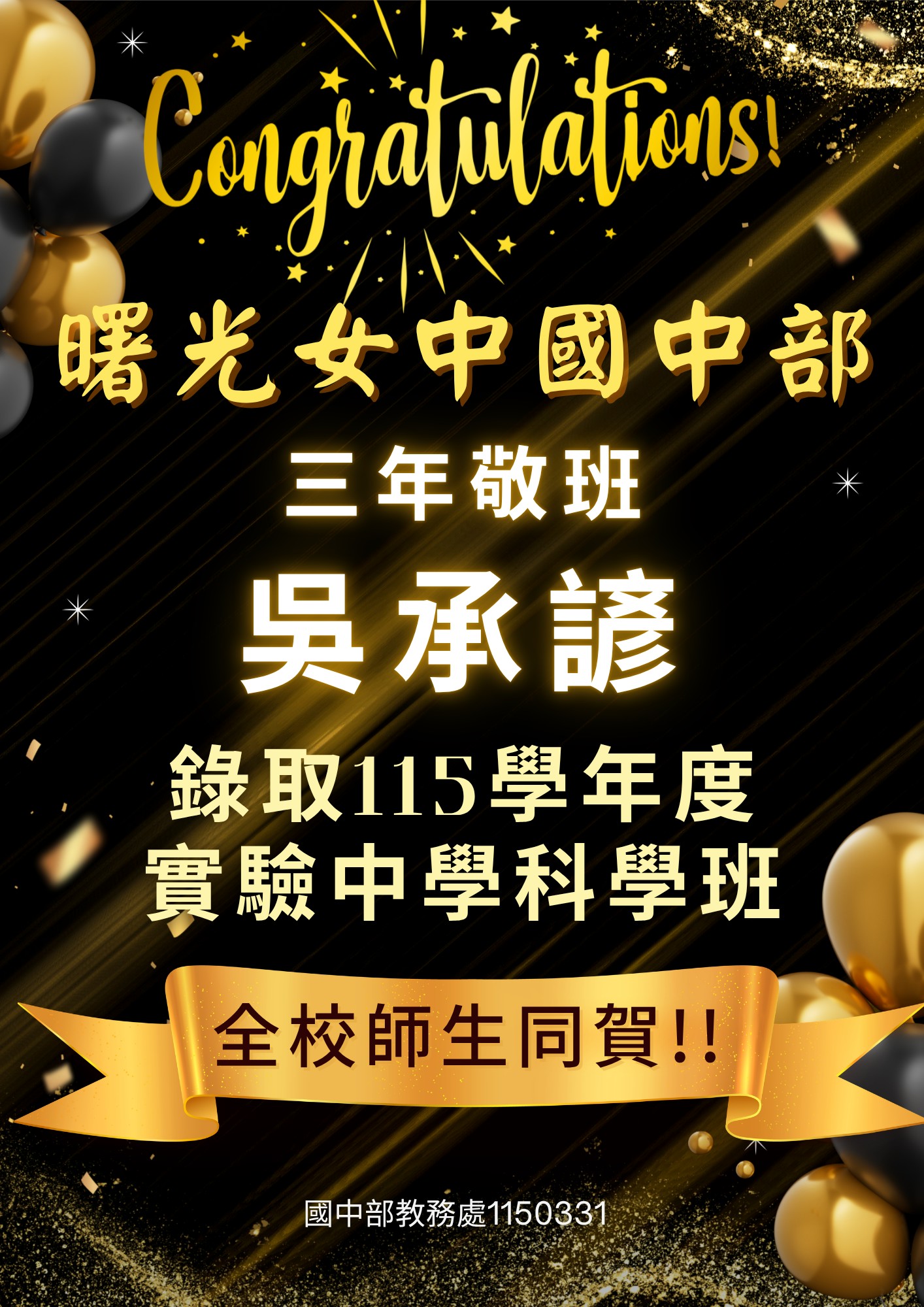 校園公告 公告主旨 狂賀! 本校國中部同學錄取115學年度實驗中學科學班 發佈日期 2026 年 3 月 31 日 發佈單位 國中部 公告類別 最新消息, 榮譽榜 公告等級 狂賀 點閱次數 28 公告內容 相關附件 115科學班錄取榜單 115科學班錄取榜單 檔案名稱檔案大小檔案格式下載115科學班錄取榜單.png554.46 KB新視窗開啟檔案 115科學班錄取榜單.png 【2026-03-31】檢送本場館辦理舞蹈歷史「臺灣舞蹈記憶地圖」計畫115年度「舞蹈 ...
