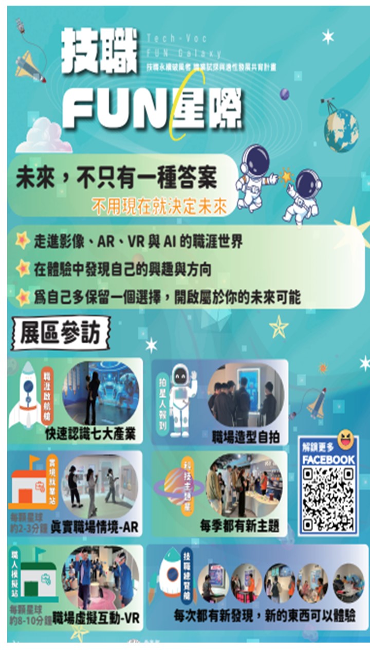 校園公告 公告主旨 轉知「技職永續破風者計畫-職業 試探與適性發展共育計畫」,有興趣者可以主動參與。 發佈日期 2026 年 3 月 18 日 發佈單位 輔導處 公告類別 最新消息 公告等級 通知 點閱次數 6 公告內容 由龍華科技大學於國立臺灣科學教育館8樓設置技職教育常設展區(技職FUN星際),展區內容聚焦七大群科,結合 影片展示、AR及VR互動體驗,以深化學生對技職教育之理解與學習興趣。有興趣者可參閱附件資料了解展區資訊。 相關附件 展區參訪 展區參訪 檔案名稱檔案大小檔案格式下載展區參訪.jpg192.55 KB新視窗開啟檔案 展區參訪.jpg 【2026-03-18】轉知由國立陽明交通大學附屬竹北高級中等學校提供適性試探課程, ...