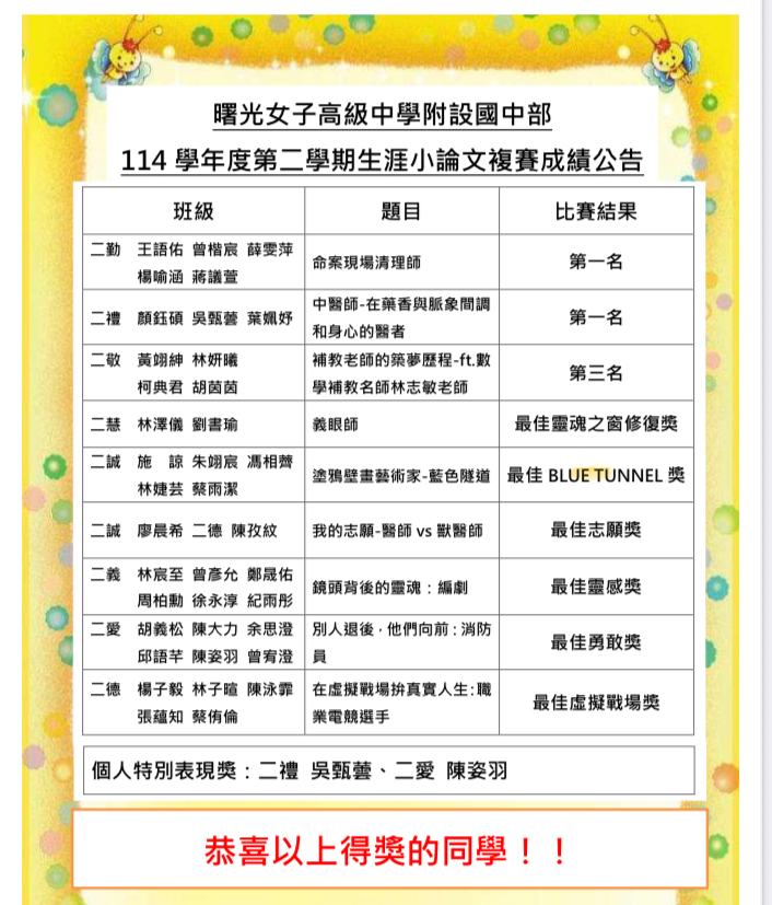 校園公告 公告主旨 114學年度第二學期生涯小論文複賽成績公告 發佈日期 2026 年 4 月 28 日 發佈單位 輔導處 公告類別 最新消息 公告等級 無 點閱次數 52 公告內容 本次生涯小論文複賽成績公告,感謝導師的協助,感謝指導老師與評審的指導。前三名組別將在5/6第七節進行生涯小論文成果發表,恭喜以上獲獎的同學!! 相關附件 【2026-04-28】116學年度技專校院統測科目選考及招生選採說明會 【2026-04-28】2026銘傳大學傳播營—寶貝老闆的築夢達成記
