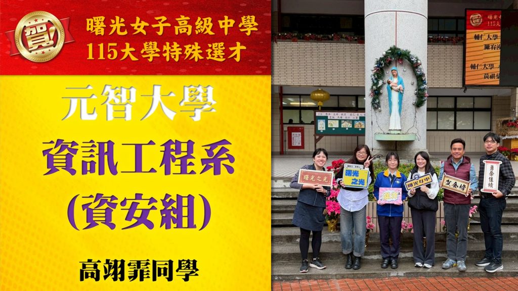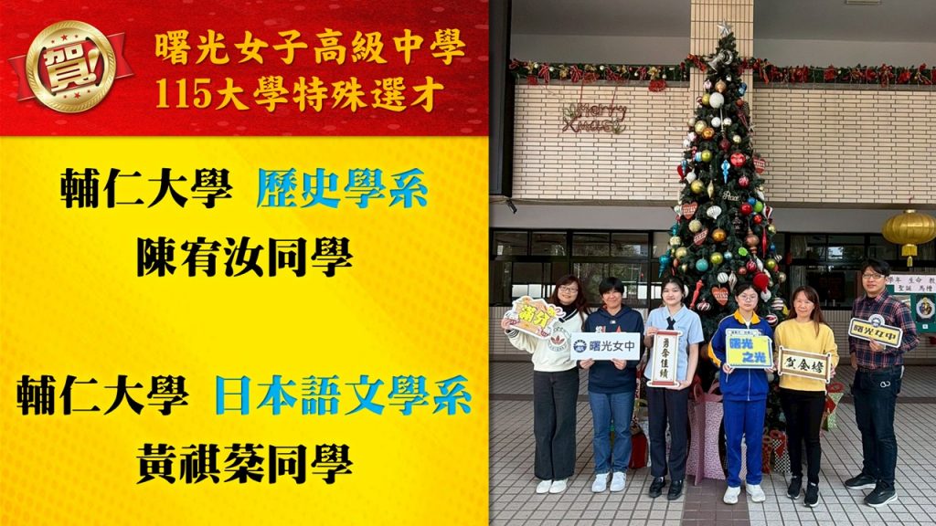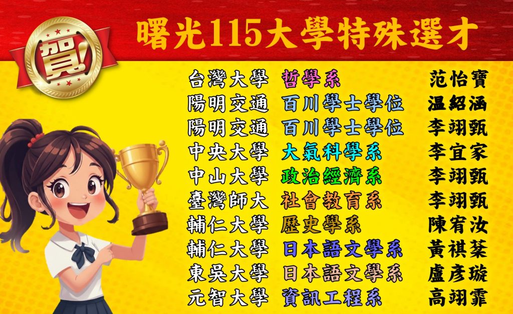 校園公告 公告主旨 115大學特殊選才榜單,曙光女中金榜耀眼! 發佈日期 2025 年 12 月 29 日 發佈單位 教務處 公告類別 最新消息, 榮譽榜 公告等級 狂賀 點閱次數 1,757 公告內容 115大學特殊選才榜單,曙光女中金榜耀眼! 相關附件 【2025-12-29】恭喜本校國中部學生代表新竹市參加114年全國語文競賽榮獲佳績! 【2025-12-29】【校車公告】114-2專車調查表單