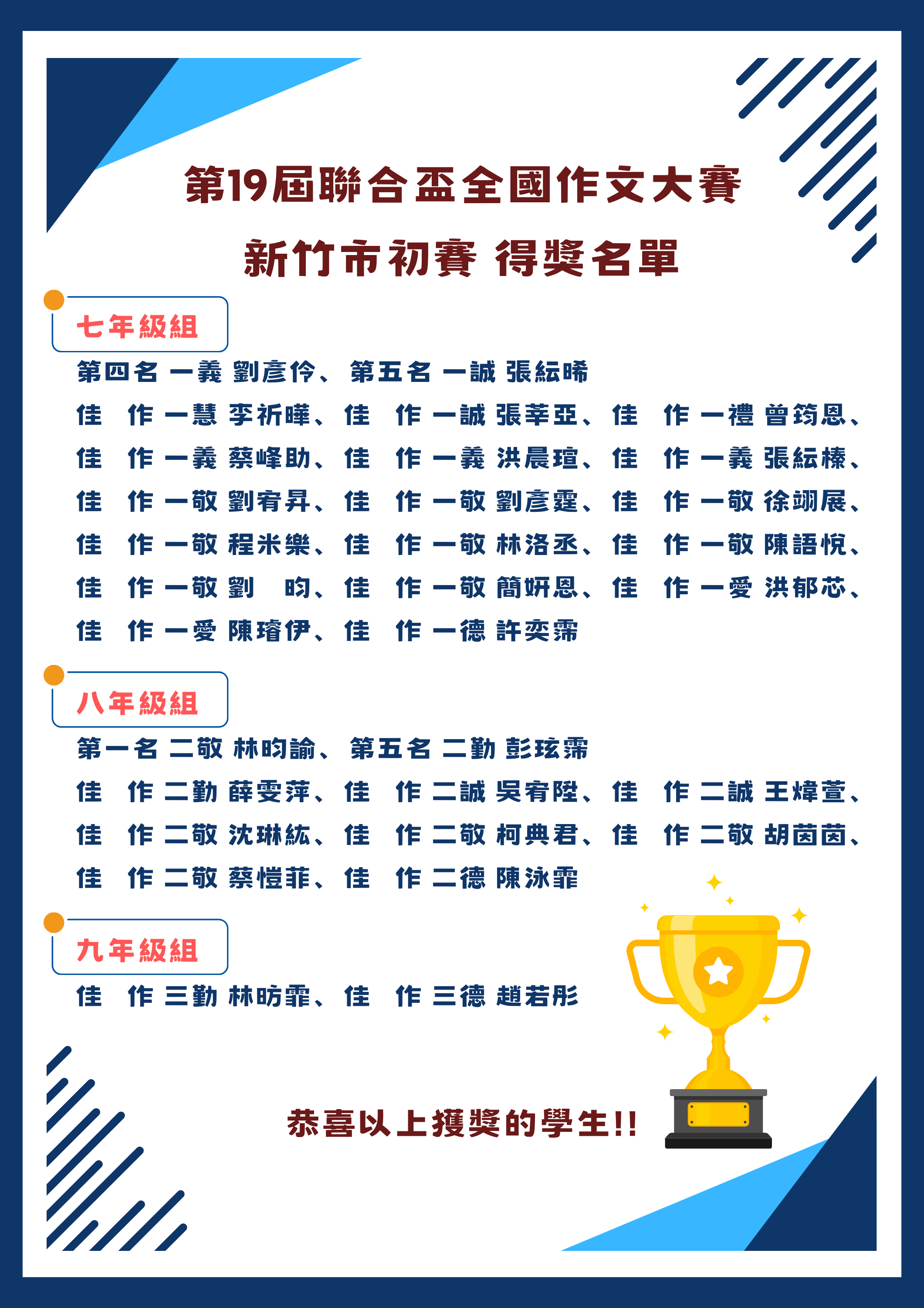 校園公告 公告主旨 2025第19屆聯合盃作文大賽-新竹市初賽國中部得獎名單 發佈日期 2025 年 11 月 21 日 發佈單位 國中部 公告類別 最新消息, 榮譽榜, 學生專區 公告等級 狂賀 點閱次數 61 公告內容 2025第19屆聯合盃作文大賽-新竹市初賽國中部得獎名單 各區初賽獲第1~5名、佳作者即可進入參加決賽,不需再次報名。 決賽日期:2025年11月29日(週六)下午2~3點 考場地點:臺北市開南中學 位置:臺北市中正區濟南路一段6號 相關附件 2025第19屆聯合盃作文大賽-新竹市初賽國中部得獎名單 2025第19屆聯合盃作文大賽-新竹市初賽國中部得獎名單 檔案名稱檔案大小檔案格式下載第19屆聯合盃作文大賽新竹市初賽得獎名單.pdf66.31 KB新視窗開啟檔案 第19屆聯合盃作文大賽新竹市初賽得獎名單.pdf 相關連結 第19屆聯合盃全國作文大賽 【2025-11-21】函轉內政部移民署辦理「114學年度新住民及子女培力與獎助(勵) ... 【2025-11-21】新竹市私立曙光女子高級中學114學年度高二校外教學採購案招標第 ...
