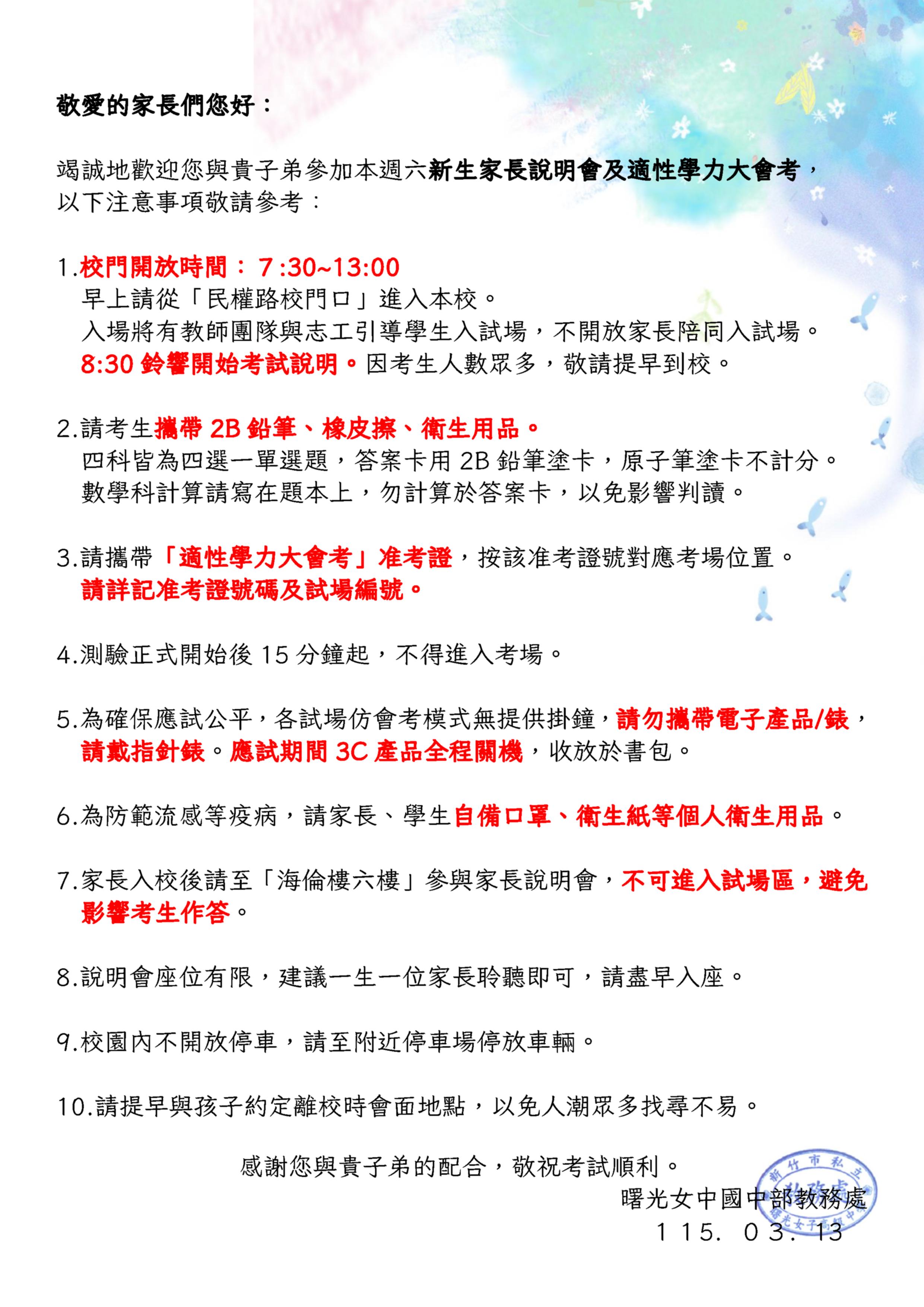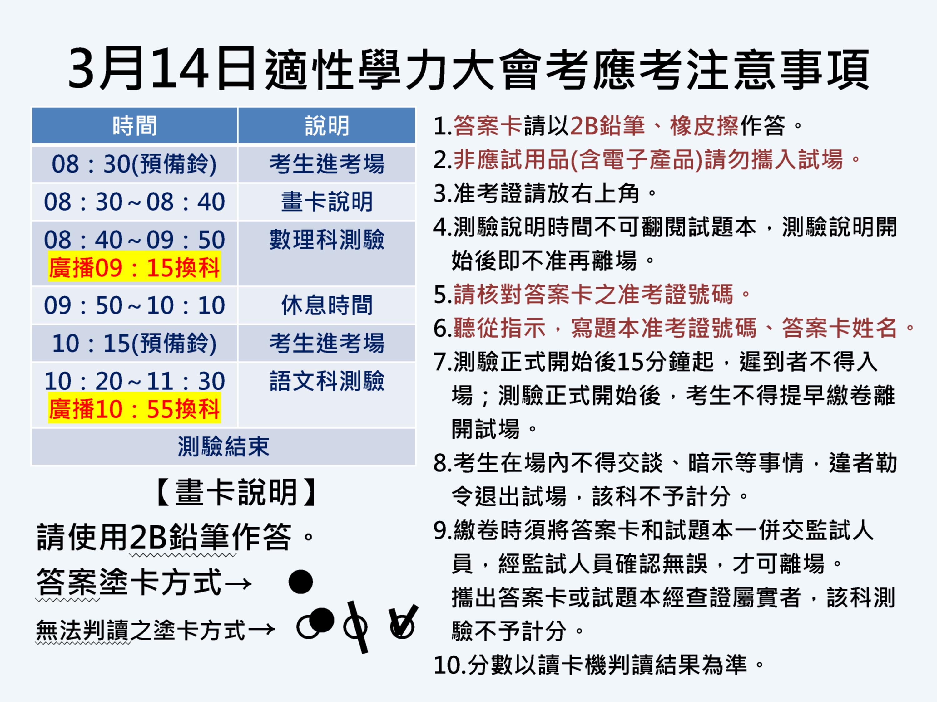 校園公告 公告主旨 3/14小六適性學力大會考應試資訊【陸續更新中】 發佈日期 2026 年 3 月 09 日 發佈單位 國中部 公告類別 最新消息 公告等級 重要 點閱次數 374 公告內容 👉請先列印第一階段報名之准考證👈 相關附件 教室投影用-試場注意事項 教室投影用-試場注意事項 檔案名稱檔案大小檔案格式下載6-3 3月14日適性學力大會考(投影用).jpg604.74 KB新視窗開啟檔案 6-3 3月14日適性學力大會考(投影用).jpg 教師參考用-延伸螢幕投影方式 教師參考用-延伸螢幕投影方式 檔案名稱檔案大小檔案格式下載延伸螢幕.jpg317.08 KB新視窗開啟檔案 延伸螢幕.jpg 【2026-03-09】楓杏醫學青年服務團辦理「暑期高中志工服務員招募活動」 【2026-03-09】圖書館提供多元支付影印列印服務