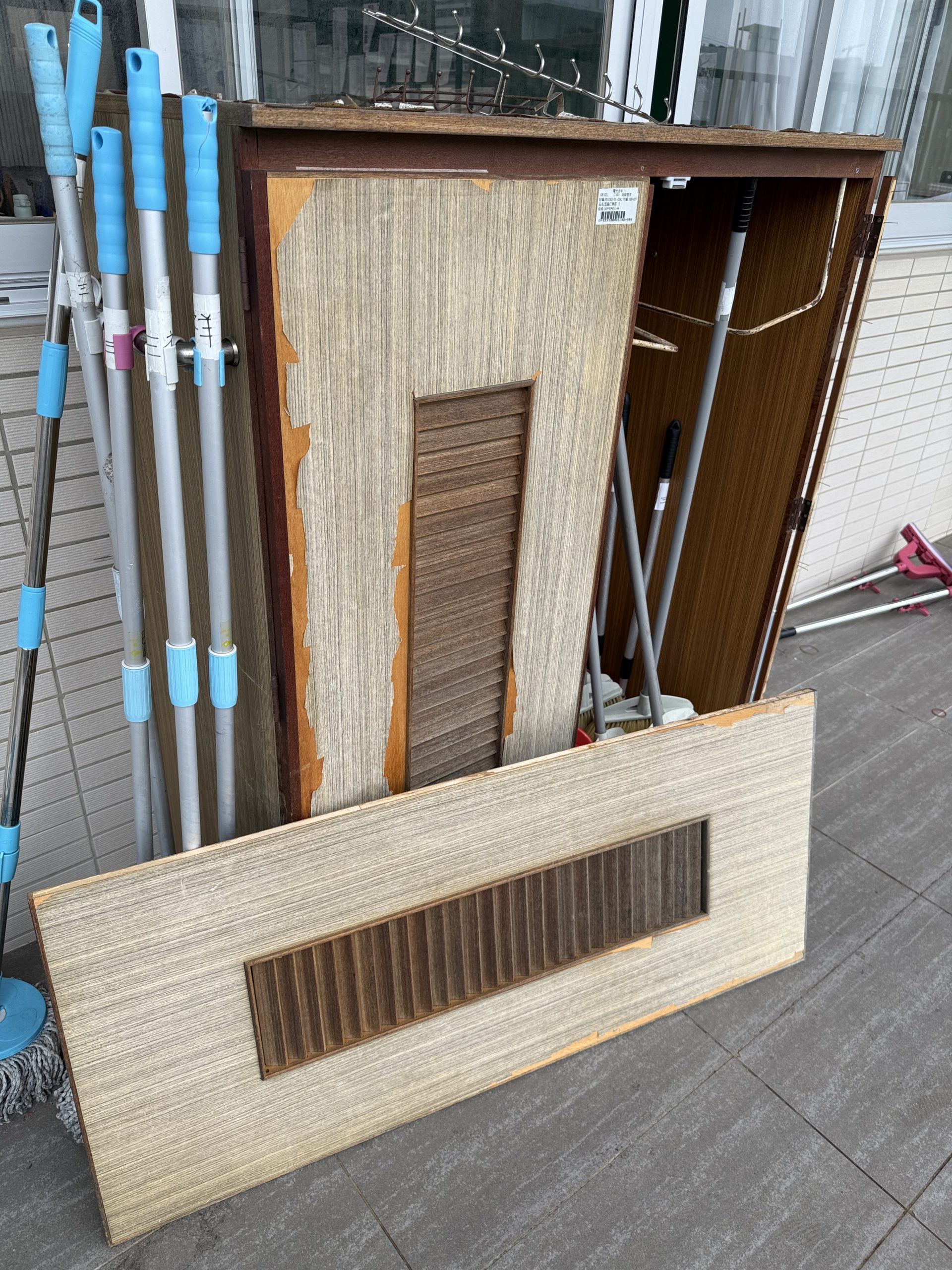 掃具櫃右側櫃門整片掉下(可能是不敵強風),目前釘子整個外露,相當危險,請幫忙儘速處理。